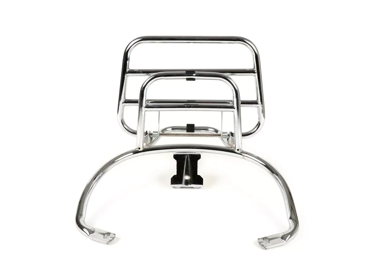 Moto Nostra bagagerek met klassieke en populaire vouwfunctie. De vouwfunctie zorgt ervoor dat de bagagedragers bij onbelading strak tegen het voertuig aanliggen en een mooie optische eenheid vormen met het voertuig. Indien nodig bieden ze een indrukwekkende laadruimte waarop zelfs grote voorwerpen zoals kampeeruitrusting veilig kunnen worden vastgesjord. De voorbagagedrager is op twee punten aan de carrosserie vastgeschroefd, net als de originele Piaggio bagagedrager. De benodigde gaten in de cascade zijn snel gemaakt door de voortekening op de achterkant van de hoornkuip. Aan de onderkant wordt de drager ondersteund door stabiele rubberen voetjes op het chassis. Door de zuignapfunctie wordt de bagagedrager extra beveiligd.