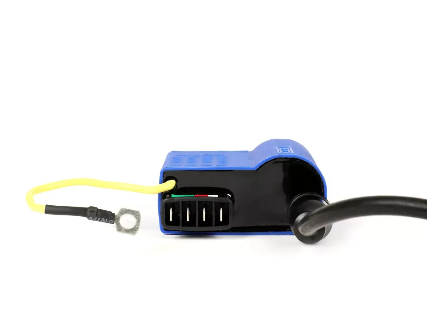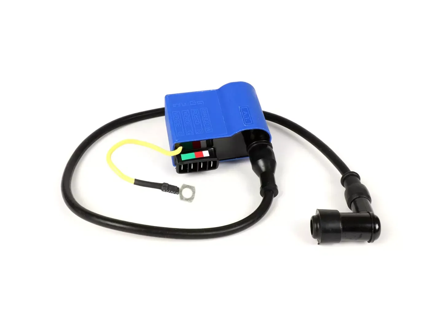 bgm CDI met geïntegreerde bobine voor alle elektronische Vespa en Lambretta ontstekingen op basis van de zogenaamde Ducati ontsteking. Hier in de complete set direct met een passende bougiekabel en bougiestekker met de bijbehorende afdichtingsrubbers.