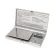 De weegschaal wordt voorgekalibreerd geleverd. Het heeft een scharnierend deksel om de gevoelige meetcellen te beschermen. Het biedt de tarrafunctie en vier verschillende weegeenheden die met een druk op de knop kunnen worden geselecteerd: g, oz, ct, gn. Afmetingen: 12x7cmInbegrepen: 2x batterij LR03 (Micro, AAA)